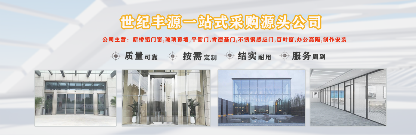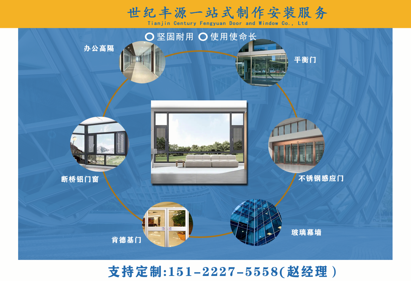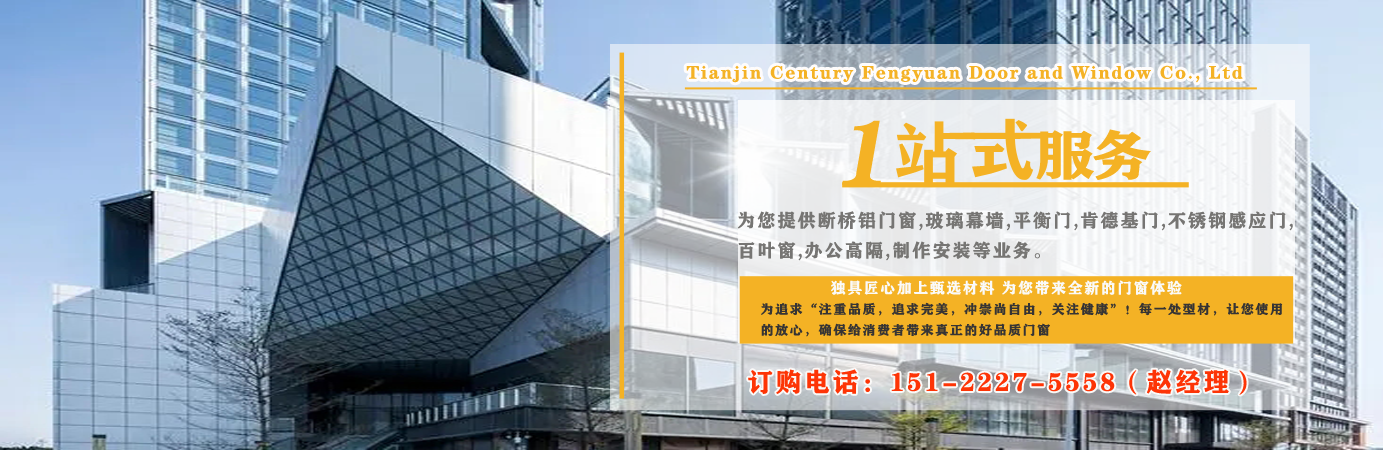 天津世紀豐源門窗有限公司從事斷橋鋁門窗,玻璃幕墻,平衡門,肯德基門,不銹鋼感應門,百葉窗,辦公高隔,制作安裝一站式訂制生產及配套服務等?! 」咀猿闪⒁詠恚冀K堅持以人才為本、誠信立業的經營原則,薈萃業界精英,成熟的技術、管理方法及企業經驗與國內企業的具體實際相結合,為企業供給各個方面的解決方案,使企業在激烈的市場競爭中始終堅持競爭力,實現企業快速、穩定地發展?! ≠|量好、服務好、才能信譽好,公司已在諸多領域取得輝煌成績,愿意成為您可信賴的長期合作伙伴。 讓我們攜手同行,共同實現“讓普通老百姓都用得上高端門窗”...